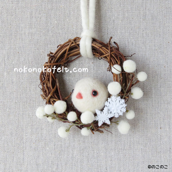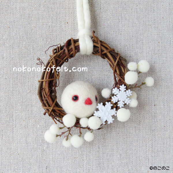 白文鳥の「ゆきちゃん」!! Tweet こんにちは! 羊毛フェルトのまんまることりへ ようこそ!! 「のこのこに作って欲しい 小鳥さんがいましたら、 メッセージください!」と LINE@に書いたところ、 メッセージをくださったYさん。 そのメッセージの最後に、 「白文鳥で『ゆきちゃん』という お名前の子が多いので、 雪のイメージで制作すると 良いかもしれませんよ!!」と 書いてくださいました。 ありがとうございます〜!! 早速、制作してみました! まんまる白文鳥「ゆきちゃん」の 可愛いリースの登場です! ピンクの嘴の「ゆきちゃん」 赤い嘴の「ゆきちゃん」 ゆきの結晶とぽわぽわ木の実の フェイクグリーンを使って、 雪の妖精のような、 かわいいリースが出来ました! 限定2個!! デザインフェスタにて 販売いたします。 白文鳥「ゆきちゃん」の 飼い主様!! お待ちしております!(笑) もちろん、 飼い主様以外の方でも 購入できますよ〜! 羊毛フェルトのまんまることりでは、 HTMLという 画像付きメールマガジンを 週一回配信しています。 上の緑の枠の画像を クリックしていただくと、 登録画面になりますので、 ぜひ登録してください!! スマホ用のかわいい壁紙も プレゼントしています! 詳しい登録の仕方はこちら↓ nokonokofelt.com/?page_id=908 LINE@でも、 情報を発信しています! スマホでこの記事を 読んでくださっている方は、 下記のボタンを押していただければ、 登録完了です!! 気持ちが「ほっこり」と やすらぐような作品を のこのこからあなたへ お届けいたします。 Tweet 投稿ナビゲーション 大きさが〜!!21〜22日は、デザインフェスタ!! コメントを残す コメントをキャンセルメールアドレスが公開されることはありません。 ※ が付いている欄は必須項目ですコメント ※ 名前 ※ メール ※ サイト 次回のコメントで使用するためブラウザーに自分の名前、メールアドレス、サイトを保存する。 Δ