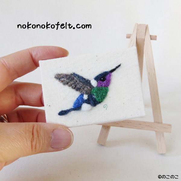 フェルティング・フラッシュ Tweet こんにちは! 羊毛フェルトのまんまることりへ ようこそ!! 先日購入した サンフェルトさんの 羊毛フェルトに混ぜて使うラメ 「フェルティング・フラッシュ」 www.sunfelt.co.jp/hobby/1750.html 使ってみたいと思っていたのですが、 このキラキラを使える鳥さんって、 なにかな??と思っていたのです。 キラキラの鳥さん! 見つけました!! 「はちどり」さん!! 羊毛刺繍をしてみました。 キラキラ羊毛が はちどりの羽の感じに ぴったりでした! この作品は、 小さなイーゼルと一緒に飾ります。 キラキラな 「フェルティング・フラッシュ」! もっと色々と使ってみたいです!! メルマガ登録してね! 羊毛フェルトの まんまることりでは、 HTMLという 画像付きメールマガジンを 週一回配信しています。 上の緑の枠の画像を クリックしていただくと、 登録画面になりますので、 ぜひ登録してください!! 上の写真のような スマホ用のかわいい壁紙も プレゼントしています! 詳しい登録の仕方はこちら↓ nokonokofelt.com/?page_id=908 LINE@もやってます! LINE@でも、 情報を発信しています! スマホでこの記事を 読んでくださっている方は、 下記のボタンを 押していただければ、 登録完了です!! LINE@でもスマホの 壁紙プレゼントをしています。 ぜひ、登録してくださいね!! 暖冬だと思って、 油断していました。 すごく寒いですね〜! 体が冷えると、 風邪をひきやすくなります。 暖かくして、おすごしください! 気持ちが「ほっこり」と やすらぐような作品を のこのこからあなたへ お届けいたします。 Tweet 投稿ナビゲーション 東西イベント終了!羊毛フェルトに積もった「ほこり」 コメントを残す コメントをキャンセルメールアドレスが公開されることはありません。 ※ が付いている欄は必須項目ですコメント ※ 名前 ※ メール ※ サイト 次回のコメントで使用するためブラウザーに自分の名前、メールアドレス、サイトを保存する。 Δ