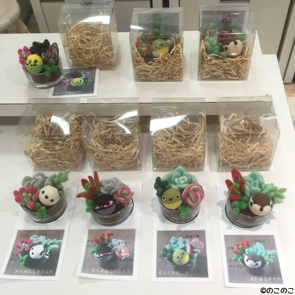 動物たちの住みか展 Tweet こんにちは! 羊毛フェルトのまんまることりへ ようこそ!! 動物たちの住みか展 今日(12日)から18日まで 渋谷西武7階サンイデー 「ウイークリーショップ」にて 開催される 「動物たちの住みか展」 昨日、搬入してきました! まんまるちゃんの他にも カゴ入りことりや 枝に留まったことり 手のりちゃんは、 新しいお座布団と一緒です。 今回一押し!!は 「多肉植物の寄せ植えと まんまることり達」 多肉植物の名前が入った リーフレットも付いています。 全部で8個(6種類)! ???! 7個しか写っていませんね〜! 残りの一個はどこにあるか、 ぜひ、渋谷西武に来て、 探してください(笑) 待ってま〜す!! 在店日は、 13日(水)、16日(土) 17日(日)です。 「ぽちっ」とクリックで応援!! にほんブログ村 よろしくお願いいたします。 壁紙プレゼントもあるよ!! 羊毛フェルトの まんまることりでは、 HTMLという 画像付きメールマガジンを 週一回配信しています。 上の緑の枠の画像を クリックしていただくと、 登録画面になりますので、 ぜひ登録してください!! 上の写真のような スマホ用のかわいい壁紙も プレゼントしています! 詳しい登録の仕方はこちら↓ nokonokofelt.com/?page_id=908 LINE@でも壁紙配布中!! LINE@でも、 情報を発信しています! スマホでこの記事を 読んでくださっている方は、 下記のボタンを 押していただければ、 登録完了です!! プレゼントの壁紙が、 メルマガと違う時もあるので、 お楽しみに!! 気持ちが「ほっこり」と やすらぐような作品を のこのこからあなたへ お届けいたします。 Tweet 投稿ナビゲーション 先週のInstagram母の日のプレゼントに最適!! コメントを残す コメントをキャンセルメールアドレスが公開されることはありません。 ※ が付いている欄は必須項目ですコメント ※ 名前 ※ メール ※ サイト 次回のコメントで使用するためブラウザーに自分の名前、メールアドレス、サイトを保存する。 Δ