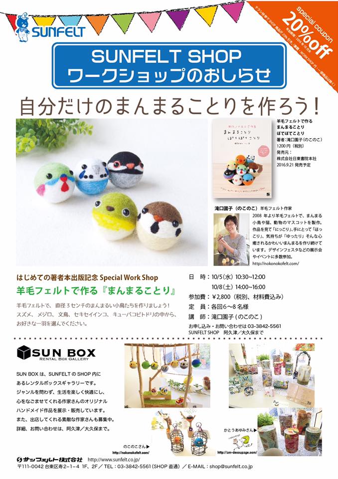 サンフェルトさんでのワークショップ Tweet こんにちは! 羊毛フェルトのまんまることりへ ようこそ!! サンフェルトさんでのワークショップ 10月5日、サンフェルトさんでも ワークショップをしました! サンフェルトさんの ワークショップスペースは、 二階にあり、広くてゆったり!! お飲み物もご自由に!スタイル!! (ネスカフェのマシンも) テーブルも大きいので、羊毛が あっちこっちいっても大丈夫!!(笑) こんなに可愛い「まんまる」たちが 出来上がりました〜!! 80代のご婦人もいらして、 かわいいまんまるちゃんを 仕上げてお帰りになられました。 ありがとうございます〜!! 明日(8日)も14時から サンフェルトさんで ワークショップがあります。 まんまることりのワークショップ 駆け込み参加2名ならOKです!! 来月は、 11月1日(火)10:30〜 11月5日(土)14:00〜 2回開催します。 まんまるちゃんと ぽてぽてちゃんの中から お好きな小鳥を一羽選んで 作ることができます。 まんまることり (スズメ、メジロ、セキセイインコ、 ブンチョウ、キューバコビトドリ) ぽてぽてことり (スズメ、メジロ、セキセイインコ、 ブンチョウ) まんまることり/2,800円(税別、材料費込み) ぽてぽてことり/4,000円(税別、材料費込み) 申し込みは、お電話で! 「のこのこのホームページを見た」と おっしゃってください。 sunfelt shop 03 3842 5561 10時〜17時(日祝休) 東京都 台東区寿2-1-4 有名なパン屋さん「ペリカン」の 近くなんです! 先日運よく購入できたのですが、 美味しかったですよ〜!! 浅草まで一駅、歩いて行けるので、 浅草観光しつつ、ワークショップ! いかがですか?? サンフェルトの マスコットキャラクター 「ボンちゃん」も待ってま〜す!! ブログ村ボタンを押して 応援お願いします!! にほんブログ村 にほんブログ村 メルマガ登録すると・・ 羊毛フェルトの まんまることりでは、 HTMLという 画像付きメールマガジンを 週一回配信しています。 上の緑の枠の画像を クリックしていただくと、 登録画面になりますので、 ぜひ登録してください!! こんなスマホの壁紙もプレゼント! リアルタイプのすずめちゃんも 可愛いでしょ?? 詳しい登録の仕方はこちら↓ nokonokofelt.com/?page_id=908 LINE@も配信中!! LINE@でも、 情報を発信しています! スマホでこの記事を 読んでくださっている方は、 下記のボタンを 押していただければ、 登録完了です!! LINE@の壁紙はメルマガの壁紙と 変えている場合もあるんですよ〜! 手軽に会話もできるので、 質問などありましたら、 LINEしてくださいね〜! 気持ちが「ほっこり」と やすらぐ作品を のこのこからあなたへ お届けいたします。 Tweet 投稿ナビゲーション 出版記念作品展でのワークショップCokets.さんの個展へ! コメントを残す コメントをキャンセルメールアドレスが公開されることはありません。 ※ が付いている欄は必須項目ですコメント ※ 名前 ※ メール ※ サイト 次回のコメントで使用するためブラウザーに自分の名前、メールアドレス、サイトを保存する。 Δ