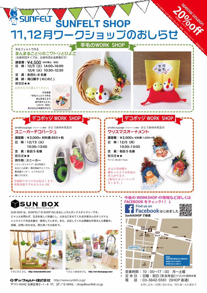 12月3日、6日はワークショップ!! Tweet こんにちは! 羊毛フェルトのまんまることりへ ようこそ!! 12月のワークショップ 12月のワークショップを 3日(土)14時〜 6日(火)10時30分〜 田原町駅徒歩2分の SUNFELT SHOPにて行います。 今回は、干支の飾り物〜!! ニワトリ&ひよこちゃん! お座布団タイプか リースタイプを選べます! 受講料/4,500円(材料費込み) 静かで、綺麗、広いお部屋で ゆったりとワークショップを してみませんか? まだお席に余裕がございます!! 申し込みは、お電話で! 「のこのこのホームページを見た」と おっしゃってください。 sunfelt shop 03 3842 5561 10時〜17時(日祝休) 東京都 台東区寿2-1-4 お待ちしております〜!! ブログ村ボタンを押して 応援お願いします!! にほんブログ村 にほんブログ村 メルマガ登録すると・・ 羊毛フェルトの まんまることりでは、 HTMLという 画像付きメールマガジンを 週一回配信しています。 上の緑の枠の画像を クリックしていただくと、 登録画面になりますので、 ぜひ登録してください!! こんなスマホの壁紙もプレゼント! リアルタイプのすずめちゃんも 可愛いでしょ?? 詳しい登録の仕方はこちら↓ nokonokofelt.com/?page_id=908 LINE@も配信中!! LINE@でも、 情報を発信しています! スマホでこの記事を 読んでくださっている方は、 下記のボタンを 押していただければ、 登録完了です!! LINE@の壁紙はメルマガの壁紙と 変えている場合もあるんですよ〜! 手軽に会話もできるので、 質問などありましたら、 LINEしてくださいね〜! 気持ちが「ほっこり」と やすらぐ作品を のこのこからあなたへ お届けいたします。 Tweet 投稿ナビゲーション 「デザフェス44」ありがとうございました!クリスマスパーティーへのお誘い コメントを残す コメントをキャンセルメールアドレスが公開されることはありません。 ※ が付いている欄は必須項目ですコメント ※ 名前 ※ メール ※ サイト 次回のコメントで使用するためブラウザーに自分の名前、メールアドレス、サイトを保存する。 Δ