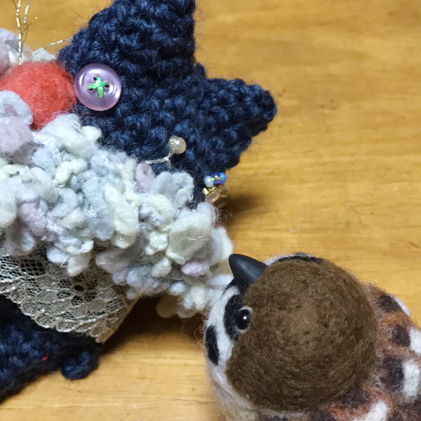 トレマーガ展ファイナルに行ってきました! Tweet こんにちは! 羊毛フェルトのまんまることりへ ようこそ!! トレマーガ展ファイナル 銀座で開催されている 「トレマーガ展ファイナル」に 行ってきました! たくさんの素敵な作品!! 編み物がしたくなります〜! 飯塚幸さんの作品! 可愛いですよね〜!! 一緒にお写真撮っていただきました! お忙しい中、 こんな素敵な作品を ちゃんと作れるって、 やっぱりすご〜い!! 幸さんは、さいたま市や日本橋三越で 教えていらっしゃいます! 全くの初心者さんも、 私みたいに自己流で 悩んだことがある方も、 ぜひ一度、幸さんのワークショップに 参加してみてくださいね! 幸さんのブログはこちら 時間の森工房 ameblo.jp/knitpanda マシマロケットさんの バッグチャームを 連れて帰ってきました。 猫ちゃんLOVE〜! トレマーガ展ファイナルは 18日(日)まで、 ギャラリー銀座で開催中! リアルすずめちゃんの撮影会?! 帰りがけ、 日が暮れた銀座、京橋でひとり すずめちゃんの撮影会(笑)を してきました!! クリスマスムード、いっぱいです! もっと上手に撮れた画像は、 23日〜のフェイスブック ツイッター、インスタグラムに 投稿します!! ぜひ、フォローしてください! お月様も綺麗でした〜! ブログ村ボタンを押して 応援お願いします!! にほんブログ村 にほんブログ村 メルマガ登録すると・・ 羊毛フェルトの まんまることりでは、 HTMLという 画像付きメールマガジンを 週一回配信しています。 上の緑の枠の画像を クリックしていただくと、 登録画面になりますので、 ぜひ登録してください!! こんなスマホの壁紙もプレゼント! リアルタイプのすずめちゃんも 可愛いでしょ?? 詳しい登録の仕方はこちら↓ nokonokofelt.com/?page_id=908 LINE@も配信中!! LINE@でも、 情報を発信しています! スマホでこの記事を 読んでくださっている方は、 下記のボタンを 押していただければ、 登録完了です!! LINE@の壁紙はメルマガの壁紙と 変えている場合もあるんですよ〜! 手軽に会話もできるので、 質問などありましたら、 LINEしてくださいね〜! 気持ちが「ほっこり」と やすらぐ作品を のこのこからあなたへ お届けいたします。 Tweet 投稿ナビゲーション クリスマスパーティーへのお誘い勇者ヨシヒコと導かれし七人 コメントを残す コメントをキャンセルメールアドレスが公開されることはありません。 ※ が付いている欄は必須項目ですコメント ※ 名前 ※ メール ※ サイト 次回のコメントで使用するためブラウザーに自分の名前、メールアドレス、サイトを保存する。 Δ