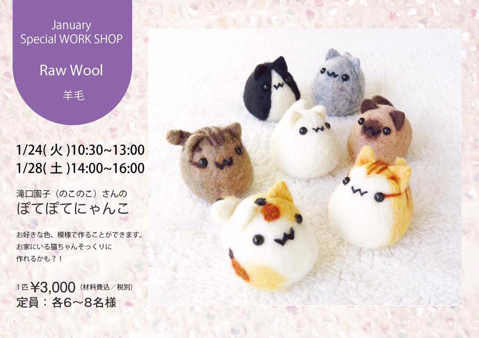 1月のワークショップ Tweet こんにちは! 羊毛フェルトのまんまることりへ ようこそ!! 1月のワークショップ 昨年、クリスマス前にお知らせした 1月のワークショップ。 年末年始のお忙しい中、 ブログチェックできなかった方の ために再度募集します〜!! 1月のワークショップは、 24日(火)& 28日(土)に開催! 今回は〜 「ぽてぽてにゃんこ」ちゃん!! 手のひらにちょこんと載るサイズの 可愛いおにぎり型のにゃんこちゃん。 お好きな毛色、柄で 作っていただけます。 おうちの猫ちゃんそっくりに 作っちゃう?!! プレゼントにもぴったりですよ! お待ちしております。 場所は銀座線 田原町駅 徒歩2分 SUNFELT SHOPさん 広いワークショップスペースで、 ゆったりと制作できます。 参加費は3,000円(税別) 持ち物はありませんので、 手ぶらでいらしてくださいね! 申し込みは 下記申し込みフォームより 承ります〜!! *1月のワークショップお申し込み エラー: コンタクトフォームが見つかりません。 ブログ村ボタンを押して 応援お願いします!! にほんブログ村 にほんブログ村 メルマガ登録すると・・ 羊毛フェルトの まんまることりでは、 HTMLという 画像付きメールマガジンを 週一回配信しています。 上の緑の枠の画像を クリックしていただくと、 登録画面になりますので、 ぜひ登録してください!! こんなスマホの壁紙もプレゼント! リアルタイプのすずめちゃんも 可愛いでしょ?? 詳しい登録の仕方はこちら↓ nokonokofelt.com/?page_id=908 LINE@も配信中!! LINE@でも、 情報を発信しています! スマホでこの記事を 読んでくださっている方は、 下記のボタンを 押していただければ、 登録完了です!! LINE@の壁紙はメルマガの壁紙と 変えている場合もあるんですよ〜! 手軽に会話もできるので、 質問などありましたら、 LINEしてくださいね〜! 気持ちが「ほっこり」と やすらぐ作品を のこのこからあなたへ お届けいたします。 Tweet 投稿ナビゲーション にゃんこ展6みなさんが作った「まんまることり」 コメントを残す コメントをキャンセルメールアドレスが公開されることはありません。 ※ が付いている欄は必須項目ですコメント ※ 名前 ※ メール ※ サイト 次回のコメントで使用するためブラウザーに自分の名前、メールアドレス、サイトを保存する。 Δ