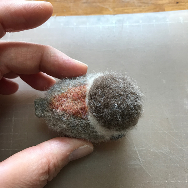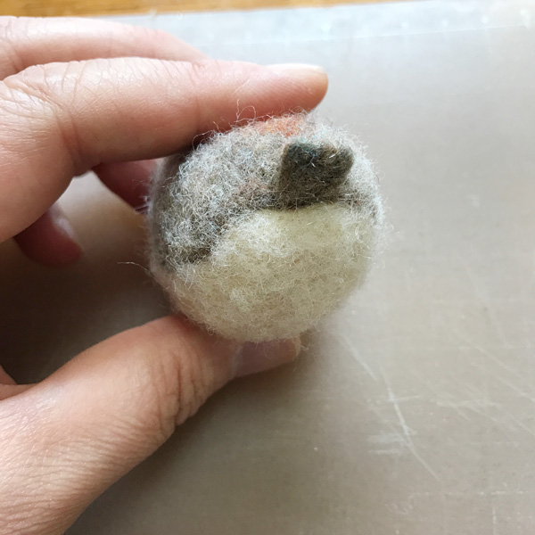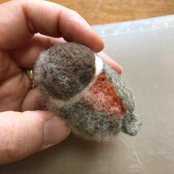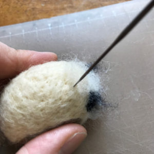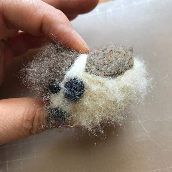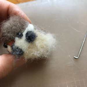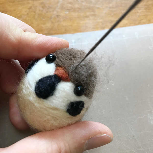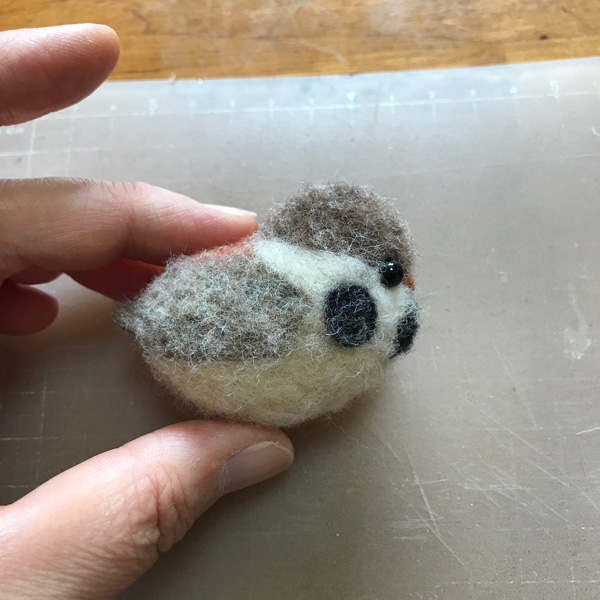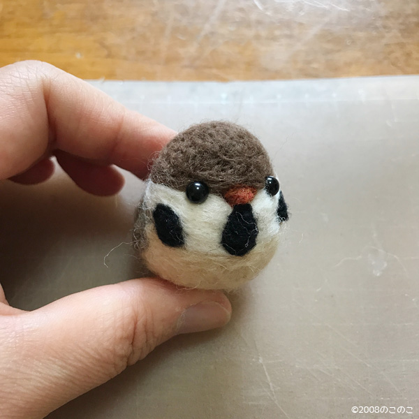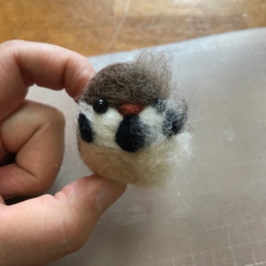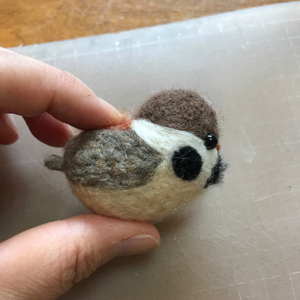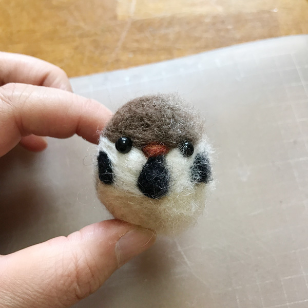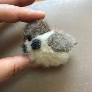 リバース細針でぽてぽてことり®を作ってみた!! Tweet こんにちは! 羊毛フェルトのまんまることりへ ようこそ!! リバース細針 ベース羊毛でお世話になっている 「ペレンデール鎌倉」さん 色々と面白いニードルがあるのですが 最近発売になった リバース細針!!! この針は、刺し固めるのではなく 刺して抜くとき、毛羽立たせる針です。 針先を見ると バーブ(切れ込み)が逆になっています。 このニードルを使ったら、 どんな子が出来るか作ってみました。 小さな ぽてぽてことり® を毛羽立たせてみた! この「ぽてぽてことり®」の すずめちゃんに 協力していただきました(笑) 今回のリバース細針は、 毛をニードルで引き出す感じになるので、 生成り色のベースの上に いつもよりも厚めに色の羊毛を 刺し固めてあります。 頭から毛羽立たせたのですが、 厚くちゃいろの羊毛を 重ねているのも関わらず、 ベースの生成り色が出てきてしまいます。 浅く刺しても、 ベース羊毛が出やすいと思いました。 首からお腹へチクチクチク 羽の部分を刺さないと、 硬いフェザーっぽい感じに 使い分け出来そうです。 今回は尾羽以外すべて刺してみました。 半分刺してみた感じ。 向かって右半分を リバース針で刺しました。 ボワボワ〜〜!! 軽くカットして、毛の長さを整えると ちょっと可愛い!! 刺した面はふわふわでも 反対面はいつものぽてぽてことり® 色が濃いと、毛羽立っているのが わかりやすいですね! 芯の生成り色が出ています。 半分だとかわいそうなので、 全身を毛羽立たせてみました。 ふわふわ! こっちの面もふわふわに! ちょっと子すずめっぽい感じ! 出来上がり〜! フロッキー加工したような感じで 面白いですね!! フロッキー加工とは、ノリで毛羽を 貼り付ける加工のことです。 有名なものでは 「シルバニアファミリー」のお人形! あれがフロッキー加工です。 お約束の「オシリスキー」!! 短い羊毛の肌触りが 可愛らしい作品になりました。 リバース細針を使ってみての感想 *ベース羊毛の色が出てしまう *色分けは、しっかりと ブロックごとに分けないと 色が混色する *小さい作品の 縞模様などには不向き ベースの羊毛の色が出てくるのを 見越して作るのもアリだな!と 思っております。 植毛しないけど、 ちょっとふんわりさせたい。 毛足の短い子を作りたい場合は、 大変役立つニードルだと思いました。 ふんわりすずめちゃんとして、 作品に取り入れていきたいと 思います。 11月のデザフェスで、 ふくらすずめが増殖しているかも! ブログ村ボタンを押して 応援お願いします!! にほんブログ村 にほんブログ村 メルマガ登録すると・・ 羊毛フェルトの まんまることりでは、 HTMLという 画像付きメールマガジンを 週一回配信しています。 上の緑の枠の画像を クリックしていただくと、 登録画面になりますので、 ぜひ登録してください!! こんなスマホの壁紙もプレゼント! リアルタイプのすずめちゃんも 可愛いでしょ?? 詳しい登録の仕方はこちら↓ nokonokofelt.com/?page_id=908 LINE@も配信中!! LINE@でも、 情報を発信しています! スマホでこの記事を 読んでくださっている方は、 下記のボタンを 押していただければ、 登録完了です!! LINE@の壁紙はメルマガの壁紙と 変えている場合もあるんですよ〜! 手軽に会話もできるので、 質問などありましたら、 LINEしてくださいね〜! 気持ちが「ほっこり」と やすらぐ作品を のこのこからあなたへ お届けいたします。 Tweet 投稿ナビゲーション 羊毛フェルトで作る「まんまる柴犬」出来ました!北浦和の「カユカヤン」さんに行ってきた!! コメントを残す コメントをキャンセルメールアドレスが公開されることはありません。 ※ が付いている欄は必須項目ですコメント ※ 名前 ※ メール ※ サイト 次回のコメントで使用するためブラウザーに自分の名前、メールアドレス、サイトを保存する。 Δ