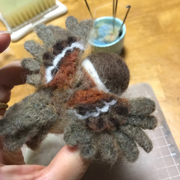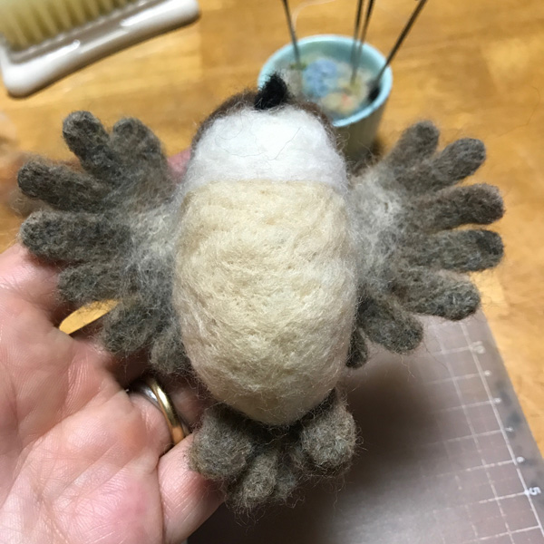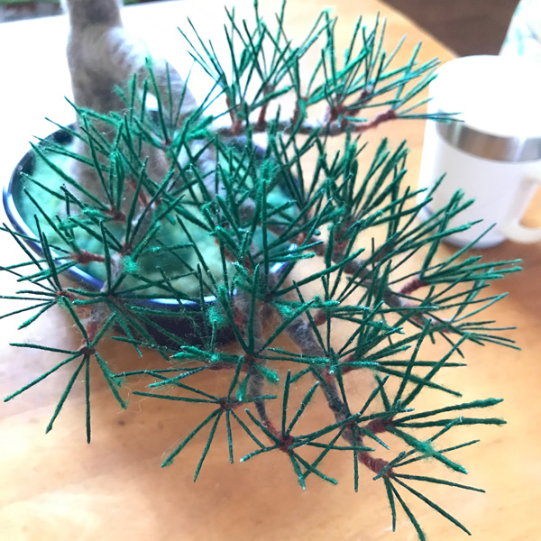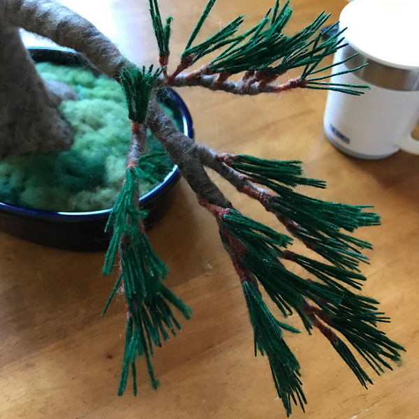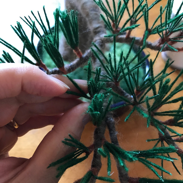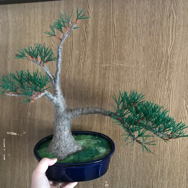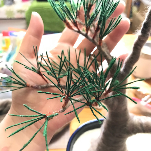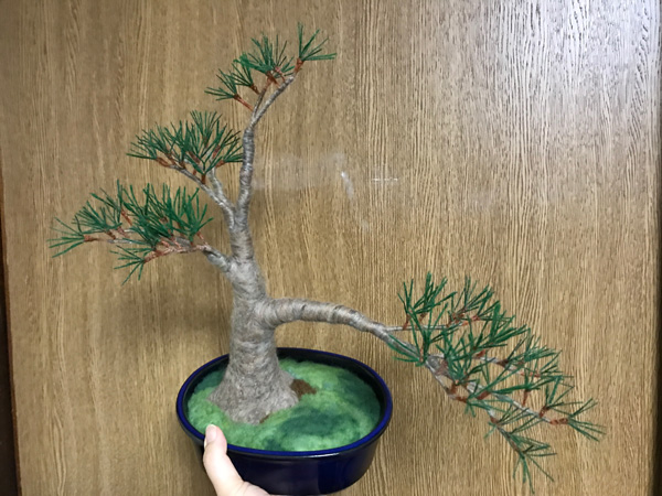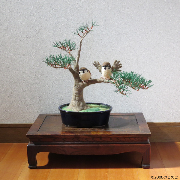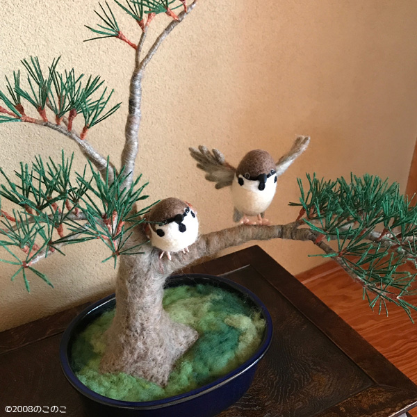 羊毛フェルト盆栽とすずめ Tweet 11月11〜12日 東京ビッグサイト東館で開催される 「デザインフェスタvol.46」 F-494 で、お待ちしております!! 羊毛フェルト盆栽 今回、いつもの まんまることり®に加えて 初の「羊毛フェルト盆栽」を 展示販売いたします。 羊毛フェルトで盆栽を作り そこにまんまることり®や リアルなことりちゃんを留まらせる 作品を多数販売いたします。 指に乗るほど小さな 超ミニ盆栽も多数出品します。 前回、大きな反響をいただいた 苔玉、多肉植物もありますよ! 羊毛フェルトで作る「松の盆栽」制作過程 今回の目玉!! ランドマーク的な大きな作品の 「松の盆栽とすずめ」 こちらの制作過程をご紹介します。 松の盆栽は、松葉をたくさん作るのが 大変なんです!! 飽きっぽい私にとって、 修行のようでした。 葉の一本一本を作り、まとめて、 木に仕立てていきます。 松葉を作り 枝にしていきます 最初はこれで良いかと思ったのですが やはり葉数が少ないので、 追加です(泣) 葉を閉じて、追加の葉をつけて 一本一本開いていきます 気持ちボリューミーになりました 前の画像と比べても、 葉数が増えて良くなりました!! 根張りも直したんですよ〜! 留まらせる小鳥は?!! 盆栽が大きいものなので、 2羽留まらせます! 枝に留まろうとしている姿にしたくて 羽を広げています こんな感じかな?? 出来上がった羊毛フェルト盆栽とリアルすずめ 私が作るすずめは いつだって「むっちり」(笑) 枝に留まりそうな時も やっぱりむっちりボディーでした。 羽を広げたすずめちゃんは 着地体制なので、 脚の指も広げています。 デザフェスでぜひ見てくださいね!! ブログ村ボタンを押して 応援お願いします!! にほんブログ村 にほんブログ村 メルマガ登録すると・・ 羊毛フェルトの まんまることりでは、 HTMLという 画像付きメールマガジンを 週一回配信しています。 上の緑の枠の画像を クリックしていただくと、 登録画面になりますので、 ぜひ登録してください!! こんなスマホの壁紙もプレゼント! リアルタイプのすずめちゃんも 可愛いでしょ?? 詳しい登録の仕方はこちら↓ nokonokofelt.com/?page_id=908 LINE@も配信中!! LINE@でも、 情報を発信しています! スマホでこの記事を 読んでくださっている方は、 下記のボタンを 押していただければ、 登録完了です!! LINE@の壁紙はメルマガの壁紙と 変えている場合もあるんですよ〜! 手軽に会話もできるので、 質問などありましたら、 LINEしてくださいね〜! 気持ちが「ほっこり」と やすらぐ作品を のこのこからあなたへ お届けいたします。 Tweet 投稿ナビゲーション 【みなさんの作品】小さなコザクラインコちゃんまんまることり®は「 F-494 」 コメントを残す コメントをキャンセルメールアドレスが公開されることはありません。 ※ が付いている欄は必須項目ですコメント ※ 名前 ※ メール ※ サイト 次回のコメントで使用するためブラウザーに自分の名前、メールアドレス、サイトを保存する。 Δ