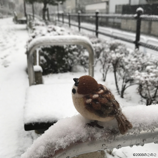 羊毛フェルトのすずめちゃんと雪 Tweet 1月22日(月)関東でも 4年ぶりの積雪でした。 雪が降ると言っているのに 横浜でランチ!! ホテルバイキング〜! 嬉しい!! 美味しい〜!! 「アスパラガスが美味しいって、 ママが言ってたチュン」 時間ギリギリまで スイーツをいただく(笑) 「食べすぎだと思うチュン」 でも、食べた後は急いで帰宅! 帰りがけに 羊毛フェルトのスズメちゃん (チュン太郎)をモデルに 撮影大会〜!! 斜めに降る雪もなんのその! 人っ子一人いやしない。 「ぼく、寒い〜チュン」 「足がひえひえチュン」 この他の画像は、 ツイッター、インスタグラム、 フェイスブックの朝投稿で ご紹介しています! ぜひそちらも チェックしてくださいね!! ブログ村ボタンを押して 応援お願いします!! にほんブログ村 にほんブログ村 メルマガ登録すると・・ 羊毛フェルトの まんまることりでは、 HTMLという 画像付きメールマガジンを 週一回配信しています。 上の緑の枠の画像を クリックしていただくと、 登録画面になりますので、 ぜひ登録してください!! こんなスマホの壁紙もプレゼント! リアルタイプのすずめちゃんも 可愛いでしょ?? 詳しい登録の仕方はこちら↓ nokonokofelt.com/?page_id=908 LINE@も配信中!! LINE@でも、 情報を発信しています! スマホでこの記事を 読んでくださっている方は、 下記のボタンを 押していただければ、 登録完了です!! LINE@の壁紙はメルマガの壁紙と 変えている場合もあるんですよ〜! 手軽に会話もできるので、 質問などありましたら、 LINEしてくださいね〜! 気持ちが「ほっこり」と やすらぐ作品を のこのこからあなたへ お届けいたします。 Tweet 投稿ナビゲーション 羊毛フェルトのペンギンを作ります!!第17回東京国際キルトフェスティバル コメントを残す コメントをキャンセルメールアドレスが公開されることはありません。 ※ が付いている欄は必須項目ですコメント ※ 名前 ※ メール ※ サイト 次回のコメントで使用するためブラウザーに自分の名前、メールアドレス、サイトを保存する。 Δ