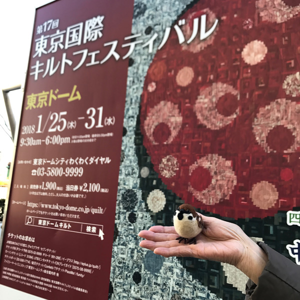 第17回東京国際キルトフェスティバル Tweet チュン太郎はどこにいるでしょうか!? ヒントは右上の白いドーム! 正解は〜 東京ドームです! キルトはしない私が、 なぜか毎年訪れる(笑) 「キルトフェスティバル」 実母がキルトが好きで、 長年作品を作っていました。 実家には、母が作った キルト作品がいっぱいあります。 軽度認知症になってからは、 針を持つことも なくなってしまったのですが、 このキルトフェスティバルだけは 一緒に行くようにしています。 今回のたくさんの作品の中で 私が一番心惹かれたのが 中山富美子さんの「モラ」 はっきりとした色合い、 デザイン化された模様 素敵でした〜!! 「東京国際キルトフェスティバル」は 31日(水)まで開催中です! たくさんの布やパーツが 販売されている中、 私が購入したのがこちら キルトフェスティバルだけど(笑) アトリエMIYATAさんの花台など を購入しました! 羊毛盆栽にすっごく合いそうでしょ! 撮影に使っていきますよ〜!! 良いお買い物ができました。 ブログ村ボタンを押して 応援お願いします!! にほんブログ村 にほんブログ村 メルマガ登録すると・・ 羊毛フェルトの まんまることりでは、 HTMLという 画像付きメールマガジンを 週一回配信しています。 上の緑の枠の画像を クリックしていただくと、 登録画面になりますので、 ぜひ登録してください!! こんなスマホの壁紙もプレゼント! リアルタイプのすずめちゃんも 可愛いでしょ?? 詳しい登録の仕方はこちら↓ nokonokofelt.com/?page_id=908 LINE@も配信中!! LINE@でも、 情報を発信しています! スマホでこの記事を 読んでくださっている方は、 下記のボタンを 押していただければ、 登録完了です!! LINE@の壁紙はメルマガの壁紙と 変えている場合もあるんですよ〜! 手軽に会話もできるので、 質問などありましたら、 LINEしてくださいね〜! 気持ちが「ほっこり」と やすらぐ作品を のこのこからあなたへ お届けいたします。 Tweet 投稿ナビゲーション 羊毛フェルトのすずめちゃんと雪本物の「盆栽」ワークショップに参加しました! コメントを残す コメントをキャンセルメールアドレスが公開されることはありません。 ※ が付いている欄は必須項目ですコメント ※ 名前 ※ メール ※ サイト 次回のコメントで使用するためブラウザーに自分の名前、メールアドレス、サイトを保存する。 Δ