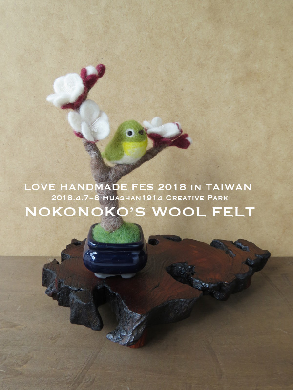 LOVE HANDMADE FES 2018 IN 台灣 Tweet 日本超人氣手作達人來囉!大家一起來體驗吧! LOVE HANDMADE FES 2018 IN 台灣 2018年4月7號、8號 在華山1914鍋爐室展開 在台灣就要舉辦DIY講座囉! 詳細內容請到以下網址 www.facebook.com/DaisukiTokyoJapan/ 2018年4月7日(土)8日(日) 台北 崋山1914文創園区 で 開催されるイベント LOVE HANDMADE FES 2018 -台湾と日本をハンドメイドで繋げよう!ー こちらに参加します。 台湾の国の花である「梅」と メジロちゃんの羊毛盆栽! 今回は、この作品が私の作品の テーマ作品になっております! 今年も台湾に行って、物販や、 ワークショップができるのが、 嬉しいです〜〜!! 今回は、羊毛盆栽や羊毛苔玉も たくさん持って行きたいので、 制作頑張ります! 在台灣就要舉辦DIY講座囉! 2018年4月7號 10:30~12:30 「羊毛氈的potepote胖 嘟嘟小鳥和貓咪」 有羊毛氈基底、 初學者也能簡單上手。 可選擇麻雀、綠繡眼或貓咪。 參加費用 880元 10人 可選擇;麻雀,綠繡眼,貓咪 不需帶任何道具或材料 初學者~ 羊毛フェルトベースを使った ぽてぽてことり&猫 芯に羊毛フェルトベースを使うので、 初心者でも簡単に作れます すずめ、めじろ、猫のどれか 一点を作ります。 2018年4月8號 13:30~15:30 「羊毛氈刺繡的化妝包」 在現成的化妝包上面, 用羊毛線做出刺繡圖案;小鳥,花兒等。 參加費用 880元 10人 不需帶任何道具或材料 初學者~ 羊毛フェルト刺繍のポーチ キャンパスポーチに 羊毛フェルト刺繍をします。 お好きな色の羊毛フェルトで 小鳥や花を刺します。 很期待可以和大家見面! みなさんにお会いできるのを 楽しみのしています!! ブログ村ボタンを押して 応援お願いします!! にほんブログ村 にほんブログ村 メルマガ登録すると・・ 羊毛フェルトの まんまることりでは、 HTMLという 画像付きメールマガジンを 週一回配信しています。 上の緑の枠の画像を クリックしていただくと、 登録画面になりますので、 ぜひ登録してください!! こんなスマホの壁紙もプレゼント! リアルタイプのすずめちゃんも 可愛いでしょ?? 詳しい登録の仕方はこちら↓ nokonokofelt.com/?page_id=908 LINE@も配信中!! LINE@でも、 情報を発信しています! スマホでこの記事を 読んでくださっている方は、 下記のボタンを 押していただければ、 登録完了です!! LINE@の壁紙はメルマガの壁紙と 変えている場合もあるんですよ〜! 手軽に会話もできるので、 質問などありましたら、 LINEしてくださいね〜! 気持ちが「ほっこり」と やすらぐ作品を のこのこからあなたへ お届けいたします。 Tweet 投稿ナビゲーション 【みなさんの作品】まんまることり®のセキセイちゃんたちLOVE HANDMADE FES 2018 in 台灣!ありがとうございました!! コメントを残す コメントをキャンセルメールアドレスが公開されることはありません。 ※ が付いている欄は必須項目ですコメント ※ 名前 ※ メール ※ サイト 次回のコメントで使用するためブラウザーに自分の名前、メールアドレス、サイトを保存する。 Δ