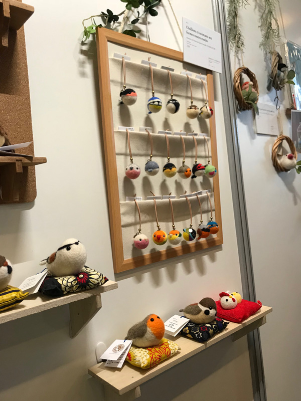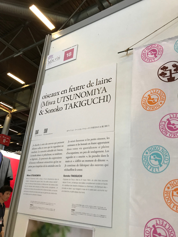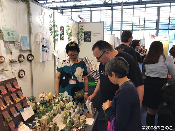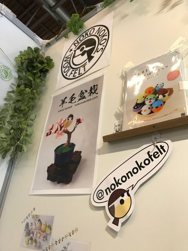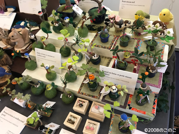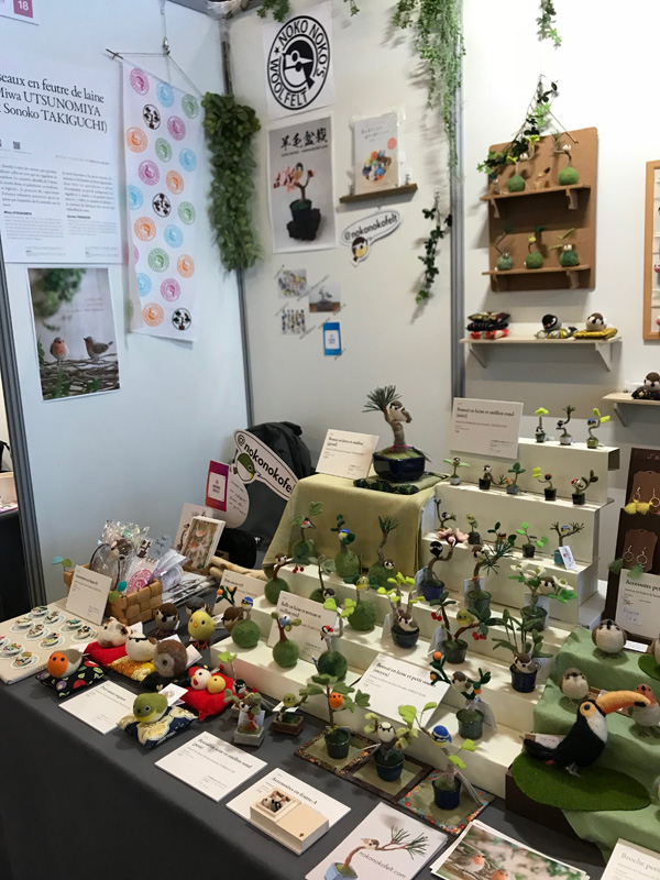 JAPAN EXPO PARIS(その2) Tweet 7/5~8 パリで開催された 「JAPAN EXPO PARIS」 4日間楽しんできました! 「のこのこ」の展示レイアウト 壁には、宇都宮先生と一緒の 看板〜! いつもデザフェスでおなじみ すずめのマークと、 本と羊毛盆栽のポスター! まんまることりや ぽてぽてことりは壁に展示 苔玉と盆栽を前に出しました。 羊毛フェルトで作った「盆栽」は 大変好評で、 写真撮られまくりました(笑) 羊毛盆栽に興味津々のご夫婦。 私は、いつものように まんまることりを頭に乗せ 肩にみけこさんを乗せての 接客です。 苔玉が思ったほど認知されていず、 意外な感じがしました。 フランスは、 湿度も高くないので、 リアルな苔玉は育てるのが 大変なのかな?! 手に取って見て いただきたかったのですが、 こんな素敵な作品は触れない!と おっしゃる方が多く、 『このような素敵な作品は 「触るように見なさい」と 教えられた』とおっしゃった お客様の言葉が印象的でした。 2日目以降は、宇都宮先生と 場所を変えてみました。 超ミニ盆栽も 手に取りやすいように前に! 2日続けて来てくださった お客様がいらっしゃたり 「素晴らしい!!」と 感想を言ってくださる方が多く すごく嬉しかったです! 私は、「こんにちは!」 「ボンジュ〜ル!」 「メルシ〜」と言いっぱなし。 毎日があっという間でした。 JAPAN EXPOのお話は、 まだ続きます〜! JAPAN EXPO PARIS(その3) おまけ画像 毎日、大きなバスで ホテルから会場まで 送り迎え付き! ありがたいです〜!! バス、涼しいチュン!! ブログ村ボタンを押して 応援お願いします!! にほんブログ村 にほんブログ村 メルマガ登録すると・・ 羊毛フェルトの まんまることりでは、 HTMLという 画像付きメールマガジンを 週一回配信しています。 上の緑の枠の画像を クリックしていただくと、 登録画面になりますので、 ぜひ登録してください!! こんなスマホの壁紙もプレゼント! リアルタイプのすずめちゃんも 可愛いでしょ?? 詳しい登録の仕方はこちら↓ nokonokofelt.com/?page_id=908 LINE@も配信中!! LINE@でも、 情報を発信しています! スマホでこの記事を 読んでくださっている方は、 下記のボタンを 押していただければ、 登録完了です!! LINE@の壁紙はメルマガの壁紙と 変えている場合もあるんですよ〜! 手軽に会話もできるので、 質問などありましたら、 LINEしてくださいね〜! 気持ちが「ほっこり」と やすらぐ作品を のこのこからあなたへ お届けいたします。 Tweet 投稿ナビゲーション JAPAN EXPO PARIS(その1)JAPAN EXPO PARIS(その3) コメントを残す コメントをキャンセルメールアドレスが公開されることはありません。 ※ が付いている欄は必須項目ですコメント ※ 名前 ※ メール ※ サイト 次回のコメントで使用するためブラウザーに自分の名前、メールアドレス、サイトを保存する。 Δ