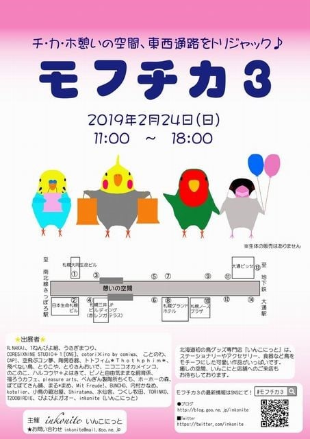 24日は「モフチカ3」!! Tweet 画像はいんこにっとさんよりお借りしました 2月24日(日) 11時〜18時 札幌地下通路にて開催される いんこにっとさん主催 小鳥イベント 「モフチカ3」に 出展いたします! まんまることり®と ぽてぽてことり®の インコちゃんたちを引き連れて 札幌に行ってきます!! 北海道の皆様! 遊びにいらしてください〜! 私の場所は、札幌駅方面のようです! お待ちしております〜!! Tweet 投稿ナビゲーション 3/5〜10「のこのこ展2019」開催![台北] potepote小鳥 幸福小鳥DIY課程 コメントを残す コメントをキャンセルメールアドレスが公開されることはありません。 ※ が付いている欄は必須項目ですコメント ※ 名前 ※ メール ※ サイト 次回のコメントで使用するためブラウザーに自分の名前、メールアドレス、サイトを保存する。 Δ