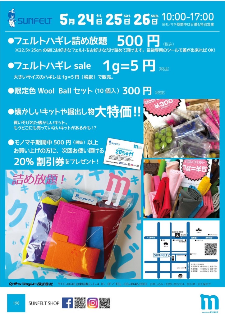 25日「モノマチ」でワークショップします! Tweet 24日〜26日 浅草橋〜田原町まで広範囲で 開催される「モノマチ」 25日(土) サンフェルトさんで 羊毛刺繍のワークショップを 行います。 今回も、羊毛刺繍した作品を くるみボタンのMiSuZuYaさんに 持っていけば、素敵なブローチに 仕立ててくださいます!! 当日も、お席が空いていれば ワークショップを受けられます! ぜひ遊びにいらしてください!! サンフェルトさんでは他にも フェルトはぎれの詰め放題! などお得なイベント 盛りだくさんです! Tweet 投稿ナビゲーション 6/2(日)羊毛フェルトフィギュアワークショップ!!6月11・15日ワークショップ/ぽてぽてことり®リターンズ!! コメントを残す コメントをキャンセルメールアドレスが公開されることはありません。 ※ が付いている欄は必須項目ですコメント ※ 名前 ※ メール ※ サイト 次回のコメントで使用するためブラウザーに自分の名前、メールアドレス、サイトを保存する。 Δ