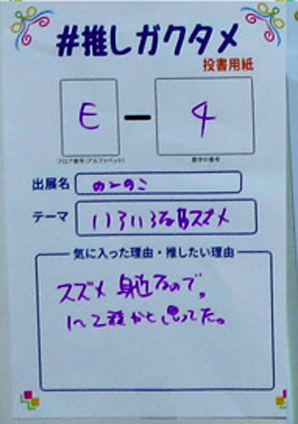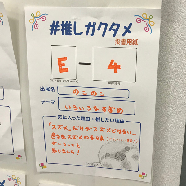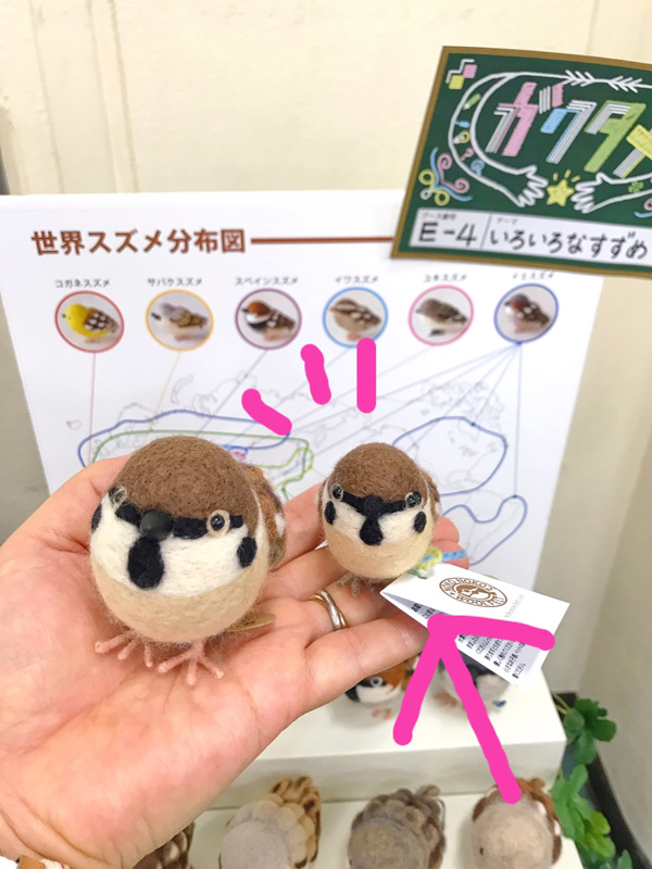 博物ふぇす御礼とプレゼント!! Tweet 7/20・21 博物ふぇすてぃばるが無事に 終了いたしました。 ありがとうございました!! 初めての参加、特にこのイベントは 「ガクモンからエンタメ」という 発表があるため、 いつものイベント以上に 緊張もありました。 大人気「すずめちゃん」 普通サイズが売り切れたため 急遽販売!小さいサイズ!この子も すぐにお迎えいただきました。 cotori×iro labo.の ちゅんぱち君も来てくれたよ〜! 来てくださった方が書いてくださる 「#推しガクタメ」 すずめのことを書いてくださった方が いらっしゃって、感涙〜〜!! ありがとうございます! お写真を撮らせていただきました。 イラスト付きや 小さいお子さんのコメントなど もう大感激です〜!! ありがとうございます!! チラシも作ってよかった〜!! 「いろいろなすずめ」チラシのネット配信 その「チラシ」ですが、 500枚印刷し初日で残り100枚! 2日目チラシ配布終了後 急遽ネットでダウンロード できるようにしました。 ご自宅のプリンターで 印刷することができます。 「いろいろなすずめ」チラシのネット配布 「いろいろなすずめ」チラシのプレゼント 大好評だった 「いろいろなすずめ」チラシを 10名の方にプレゼントいたします。 A4サイズを折らずに郵送いたします。 お申し込みはLINE公式アカウントに 「チラシください!」と コメントしてください。 郵送の為、ご住所お名前を お知らせくださる方に限ります。 (日本国内のみ) みなさんの応募お待ちしております! 応募は、29日まで! 応募ありがとうございました!! チラシを発送いたしました。 お手元に届くまで お待ちください!! ブログ村ボタンを押して 応援お願いします!! にほんブログ村 にほんブログ村 メルマガ登録すると・・ 羊毛フェルトの まんまることりでは、 HTMLという 画像付きメールマガジンを 週一回配信しています。 上の緑の枠の画像を クリックしていただくと、 登録画面になりますので、 ぜひ登録してください!! こんなスマホの壁紙もプレゼント! リアルタイプのすずめちゃんも 可愛いでしょ?? 詳しい登録の仕方はこちら↓ nokonokofelt.com/?page_id=908 気持ちが「ほっこり」と やすらぐ作品を のこのこからあなたへ お届けいたします。 Tweet 投稿ナビゲーション OSAKA手づくりフェア20199/10&14「まんまることり®のモビール」ワークショップ コメントを残す コメントをキャンセルメールアドレスが公開されることはありません。 ※ が付いている欄は必須項目ですコメント ※ 名前 ※ メール ※ サイト 次回のコメントで使用するためブラウザーに自分の名前、メールアドレス、サイトを保存する。 Δ