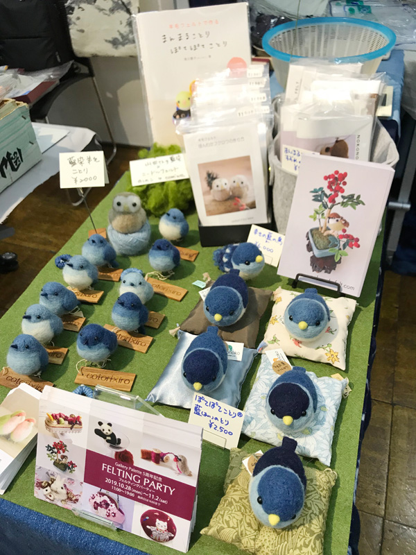 スピニングパーティーありがとうございました! Tweet 9月21日(土)22日(日)に開催された 「スピニングパーティー」 帯広で藍染をしている 工房風色さんのお手伝いで 手を青くして藍染羊毛を 計って販売してました(笑) 藍染羊毛を使った ぽてぽてことり®ちゃんと リアルタイプの小鳥ちゃんを 展示販売させていただきました。 お隣は宇都宮みわ先生の小鳥ちゃん! 超可愛い〜〜〜!! 深い藍色の小鳥たちは、 見ているだけでも癒されます。 たくさんの方に 気に入っていただけて 飛び立って行きました。 10月28日からの 南青山のグループ展で再販します。 今回来られなかった方は、 ぜひグループ展にいらして、 手にとってご覧ください〜! ブログ村ボタンを押して 応援お願いします!! にほんブログ村 にほんブログ村 オンラインショップ「いきも〜る」に出品中!! いきものグッズ専門「いきも〜る」に 出品中です!! 遠方の皆様、 ぜひこちらをご利用ください!! 出品中の作品は全て一点ものです。 いきも〜るサイト内 「のこのこ」で検索してね! メルマガ登録すると・・ 羊毛フェルトの まんまることりでは、 HTMLという 画像付きメールマガジンを 週一回配信しています。 上の緑の枠の画像を クリックしていただくと、 登録画面になりますので、 ぜひ登録してください!! こんなスマホの壁紙もプレゼント! リアルタイプのすずめちゃんも 可愛いでしょ?? 詳しい登録の仕方はこちら↓ nokonokofelt.com/?page_id=908 LINE@も配信中!! LINE@でも、 情報を発信しています! スマホでこの記事を 読んでくださっている方は、 下記のボタンを 押していただければ、 登録完了です!! LINE@の壁紙はメルマガの壁紙と 変えている場合もあるんですよ〜! 手軽に会話もできるので、 質問などありましたら、 LINEしてくださいね〜! 気持ちが「ほっこり」と やすらぐ作品を のこのこからあなたへ お届けいたします。 Tweet 投稿ナビゲーション 12月までのイベント&ワークショップのお知らせ9/29 新御徒町「ドールサイズのシマエナガちゃん」ワークショップ コメントを残す コメントをキャンセルメールアドレスが公開されることはありません。 ※ が付いている欄は必須項目ですコメント ※ 名前 ※ メール ※ サイト 次回のコメントで使用するためブラウザーに自分の名前、メールアドレス、サイトを保存する。 Δ