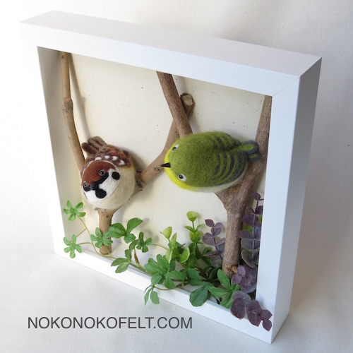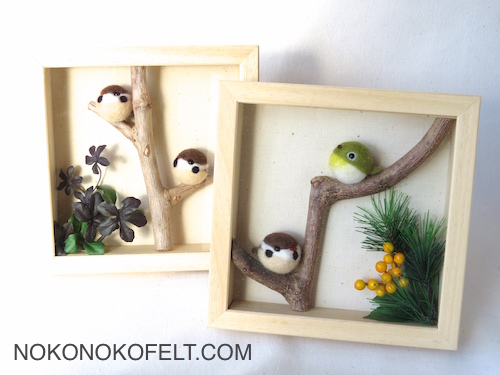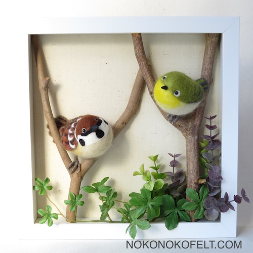 お家に飾る「ことり」たち Tweet こんにちは!! 「羊毛フェルトのまんまることり」へようこそ!! 12日から15日に出展する Bunkamura winter craft collection 2014 今までにない作品を制作しております。 リアルタイプのことりの額 立体感があるので、ガラスを入れず枝に留まっている感じを出しました。 壁にかけると、外からことりさんが入ってきたような感じに見えるかもしれません。 まんまることりの額 まんまることりさんが2羽留まっている枝を額の中に配置しました。 こちらはガラス板が入っていますので、埃に強い作品です(笑) 額に合わせて枝を切ったり、釘で打ちつけたりするのは、頭で考える以上に大変でした。 行き当たりばったりで制作しているから、大変なのかな?? リアルタイプの額は特に、手放したくないぐらい愛着のある作品になりました。 売れ残ってもいいかな?!なんて(笑) メルマガ登録がまだの方におしらせ メルマガ登録していただくと、最新イベント情報や新作などいち早くお知らせいたします。 ぜひご登録ください!! 携帯(スマホ)壁紙のプレゼントもあります!! 上記の画像をクリックすると、登録申し込み画像になりますので、ぜひ登録おねがいいたします!! 気持ちが「ほっこり」とやすらぐような作品を のこのこからあなたへお届けいたします。 Tweet 投稿ナビゲーション 12月はBunkamuraへ!!おしゃれなことりたち コメントを残す コメントをキャンセルメールアドレスが公開されることはありません。 ※ が付いている欄は必須項目ですコメント ※ 名前 ※ メール ※ サイト 次回のコメントで使用するためブラウザーに自分の名前、メールアドレス、サイトを保存する。 Δ